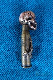 Pigiatabacco per pipe1 dim. 2,0 x alt. 7,0 cm, con teschio in rame e completo di spillo per la pulizia della pipa avvitato.