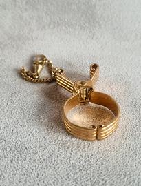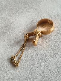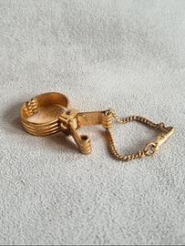 Niente distrazioni, il ritratto di un attimo preciso: siete all’ingresso di una casa, poco prima di essere annunciate. Siete appena scese da una carrozza, con il rumore delle ruote ancora nell’aria. I guanti li sfilate con calma — uno, poi l’altro — e invece di sparire in una borsa, li affidate qui. A questa piccola pinza. Li trattiene accanto al corpo, agganciata alla cintura o alla chatelaine, pronta a restituirli al primo bisogno. Un gesto semplice, ma studiato: niente si perdeva, tutto aveva il suo posto. Eleganza pura. Questa pince à gants, in ottone dorato, conserva ancora quella logica silenziosa. La molla scatta decisa, la presa è ferma — come allora. I bordi sono arrotondati per non rovinare e segnare nemmeno un po’ i vostri preziosi guanti. È uno di quegli oggetti che non si limitano a esistere: suggeriscono un’abitudine, un ritmo, quasi un modo di muoversi. E mentre la tenete in mano, è difficile non immaginare quel passaggio preciso: il momento in cui i guanti venivano tolti… ma non abbandonati. E dentro di voi l’attesa di una serata o di un ballo importante. Pince à gants da Châtelaine o borsetta Ottime condizioni