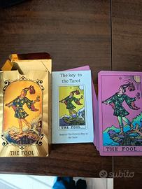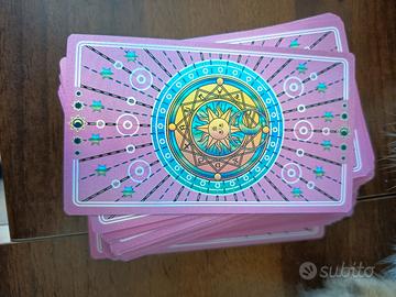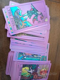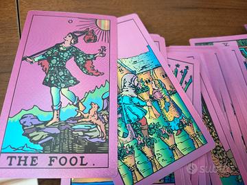 Particolarissimo mazzo olografico con fondo fucsia. Bellissimi i riflessi sulle carte. Corredato da libretto di spiegazione di ogni carta. Mai usato. Credo che la scatola non sia originale.