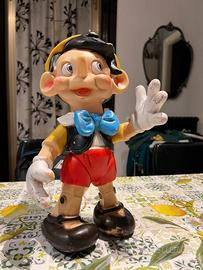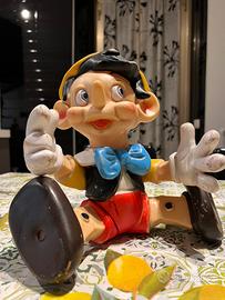 Pinocchio, prodotto da Ledraplastic, marchiato con "Elefantino e Walt Disney production" sul colletto bianco. Con braccia, gambe e testa snodate, giocato in buone condizioni presenta normali segni del tempo e di utilizzo compatibili con l'epoca, completo di fischietti sui due piedi, funzionanti. Tutto visibile dalle fotografie allegate.