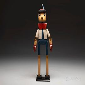 Questo Pinocchio artigianale degli anni ’60 è una scultura realizzata interamente a mano, caratterizzata da una costruzione in legno di abete dipinto a mano e da forme geometriche essenziali. Le proporzioni slanciate, i colori originali e l’espressione ingenua richiamano l’estetica del design e dell’artigianato italiano del periodo.