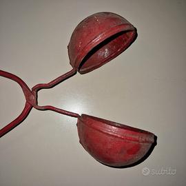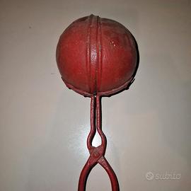 Raro attrezzo d’epoca in ferro pieno, usato per colare piombo o metallo fuso e formare sfere. Verniciato di rosso, in ottime condizioni per l’età.