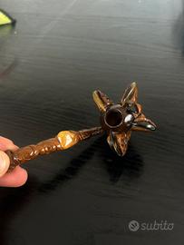 Vendo particolare pipa artigianale in legno intagliato, caratterizzata da una testa animale scolpita con grande cura nei dettagli. Presenta inserti decorativi in materiale scuro lucido e un elemento ambrato sul manico che ne valorizza ulteriormente l’estetica.