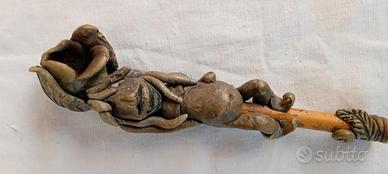 Pipa da collezione fatta a mano in argilla e bambù, vicino al bocchino pietra probabile ametista.