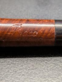 Pipa dritta in radica lucida, usata ma ben conservata. Purtroppo non riesco a interpretare la marca, mostrata in foto. Portapipa non incluso.