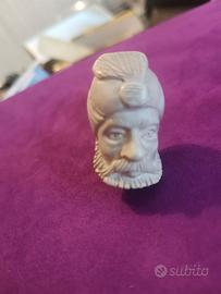 Vendo splendida pipa figurale scolpita a mano in autentica schiuma di mare (Meerschaum). Un pezzo pregiato per collezionisti o fumatori esigenti. La testa della pipa raffigura un busto di personaggio d'Oriente con barba dettagliata e turbante. La scultura è nitida e ben definita. Materiale: Testa in schiuma di mare pura, cannello in ebanite nera (bocchino integro). Condizioni: Eccellenti condizioni conservative, pochissimo fumata (mantiene il colore bianco quasi originario). Nessun danno visibile. Pregio: La schiuma di mare è famosa per non alterare il sapore del tabacco e per colorarsi di ambra con l'uso. Uso: Può essere utilizzata per fumare o esposta come oggetto d'arte.