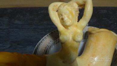 Pipa in meerschaum di alta qualità, interamente scolpita a mano da un unico blocco, raffigurante una figura femminile nuda seduta in posa classica. La testa del fornello è perfettamente integrata nella composizione scultorea. La superficie presenta una patina naturale stratificata, dai toni giallo-miele fino all’ambra, formatasi nel corso di molti decenni di utilizzo, elemento fondamentale di autenticità e valore collezionistico.