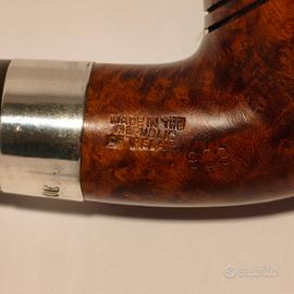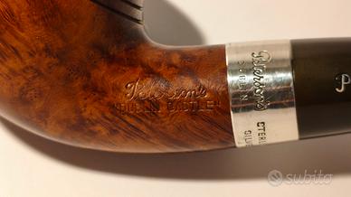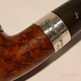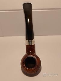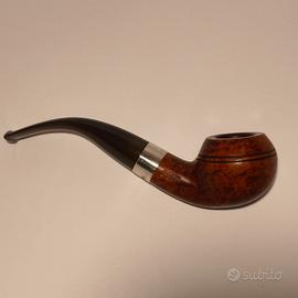 Descrizione: In vendita una prestigiosa Peterson della serie "Dublin Castle". Si tratta dello storico shape 999 (Rhodesian), una delle forme più bilanciate e famose prodotte dalla casa irlandese, nota per la sua generosa camera di combustione e la comodità di impugnatura. Caratteristiche Tecniche: Marchio: Peterson (Made in the Republic of Ireland). Serie: Dublin Castle. Shape: 999 (Rhodesian curva). Vera: Argento Sterling (925) punzonato e lucidato a specchio. I punzoni originali (Arpa, Figura Femminile, Lettera) sono chiaramente visibili sulla ghiera. Bocchino: Dotato del classico logo "P" Peterson, pulito e riportato al nero lucido originale. Stato: Oggetto da collezione, completamente restaurato. La radica è stata nutrita con oli naturali per far risaltare la splendida fiammata del legno. Fornello igienizzato e pronto all'uso. Perché acquistarla: La combinazione tra lo shape 999 e la vera in argento sterling rende questa pipa un investimento sicuro. È un pezzo che non può mancare in una rastrelliera Peterson, ideale sia per il neofita che per il fumatore esperto che cerca una fumata fresca e di carattere.