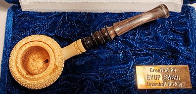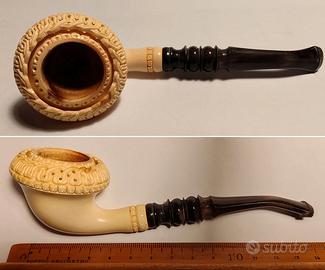 Vendo pipa in schiuma di mare realizzata dal maestro Eyup Sabri, Istanbul Turchia, anno 1990, n° 239, bocchino in corno lavorato, come da foto, completa di scatola originale, usata ma in perfetto stato. Prezzo €uro 200,00