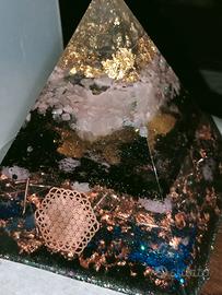 la piramide orgonica è in resina con inserimenti di cristalli quali quarzo rosa tormalina e onice, con aggiunta di filo di rame, in resina Pesa circa 1 kg, viene fornita con base luminosa di 10 cm. se interessati mando video. bellissima illuminata e sicuramente utile.