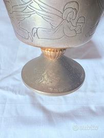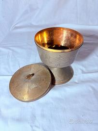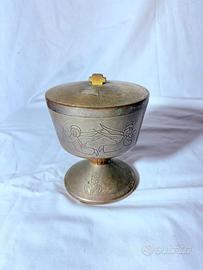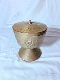 Vendo pisside porta ostia clericale da chiesa, dotato di coperchio sormontato da una croce stilizzata. La base ampia garantisce una grande stabilità. E' caratterizzato da figure di angeli incisi lungo la struttura del pisside. Presenta segni del tempo che ne testimoniano la storia e l’autenticità, rendendola particolarmente apprezzabile dai collezionisti o per ambienti liturgici tradizionali. Dopo una lavata è come nuova.