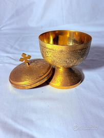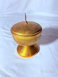 E' realizzata in metallo dorato, con coperchio sormontato da una croce stilizzata. La base ampia garantisce stabilità. Presenta segni del tempo che ne testimoniano la storia e l’autenticità, rendendola particolarmente apprezzabile dai collezionisti o per ambienti liturgici tradizionali. Dopo una lavata è come nuova.