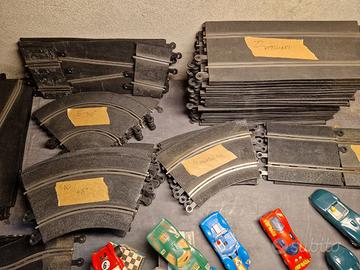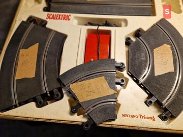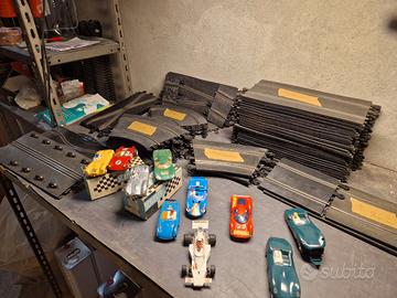 Vendo pista SCALEXTRIC in scatola originale ben conservata e parti di pista extra. Sono 28 rettilinei, 16 curve da 45°, 8 curve 90°, 2 da 22.5°, 4 curve parabola, 4 da mezzo rettilineo, 1 chicane, 1 strettoia (6 pezzi), 2 incroci. Le macchinine erano perfettamente funzionanti e le due verdi sono smontate ma ci sono tutti i pezzi. Incluso trasformatore. Non ci sono i comandi di velocita'. Il materiale e' degli anni 60/70 ed e' stato conservato bene. Le poche parti con tracce di ossidazione le ho pulite con paglietta di metallo. Il materiale lo vendo nello stato in cui e', visto e piaciuto.