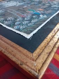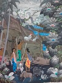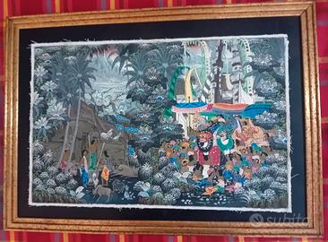 Opera d'arte tradizionale balinese,dipinto olio su tela che raffigura una scena cerimoniale Balinese,opera del 1987 dell'artista Tegig Mane originario della comunità artistica del Penestan,misura della tela poggiata su tavola cm.37X58,su cornice in legno dorata cm.50X70,molto bella.