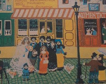 particolare fotolitografia su tela con tecniche Acrylic Pouring dimensioni 20 X 15 cm raffigurazione festa di nozze a Parigi, arte popolare naif, Beizet '97 in Pesaro volendo si effettua spedizione con tracciatura prezzo da concordare in privato