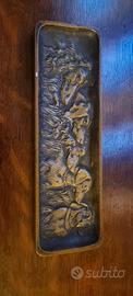 L'oggetto mostrato nell'immagine è una placca decorativa o un piccolo vassoio in metallo (probabilmente bronzo o ottone) che raffigura le teste in rilievo di cinque cani.