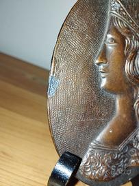 Raffinata placca ovale in rilievo raffigurante il profilo di Beatrice, celebre musa dantesca. L'opera si distingue per il gusto preraffaellita, con un'accurata lavorazione nei dettagli dei capelli, del diadema e della veste damascata. Soggetto: Ritratto ideale di Beatrice Portinari. Materiale: Lega metallica con finitura brunita effetto bronzo. La superficie presenta una bellissima patina antica e un fondo finemente martellinato che dona profondità alla figura. Oggetto vintage con normali segni del tempo. Si segnala una piccola mancanza della patinatura sul bordo sinistro (visibile in foto), Misura: 11,5 cm x 9 cm