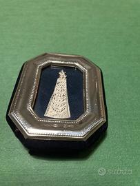 Raffigura la Madonna di Loreto con la Santa Casa, finemente cesellata su lastra d’argento, incastonata in una cornice ottagonale con bordo lavorato.