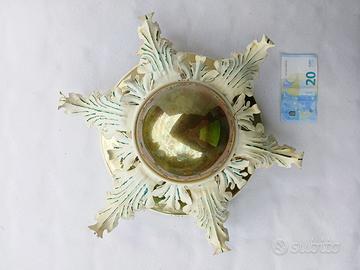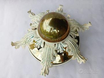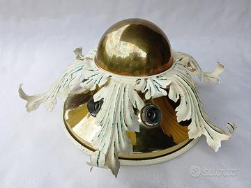Particolare lampada da soffitto vintage in ottone lucido con foglie lavorate, prodotta molto probabilmente in Germania negli anni 60. Condizioni decisamente buone, elettricamente revisionata e pronta per l'installazione. Ingombro massimo: diametro 44cm (punta foglie), altezza 20.