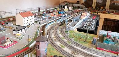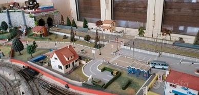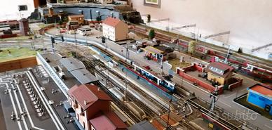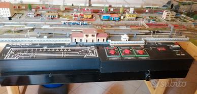 Plastico ferroviario analogico scala HO, in 5 moduli a forma "U". Misure 140 x130 - 135x130 (x2)- 166x140. Pannello sinottico autocostruito con scheda controllo semafori e scambi elettrici, piattaforma girevole 8 ricoveri con sinottico dedicato, stazione di testa con sinottico dedicato, passaggio a livello automatizzato, catenaria funzionante autocostruita ottone e rame, video sorveglianza 4 telecamere con sistema e HDD con schermo dedicato22" per intero tracciato, piu camera a distanza tramite cellulare, tutto interamente illuminato x visione notturna, tablet 10" samsung per suoni , passaggio a livello automatizzato a distanza con comandi e suoni da sinottico, linea catenaria funzionante realmente, linea tranviaria a 3 fermate temporizzate con catenaria funzionante, alcune autovetture e autobus illuminate. Interamente con sfondi laterali .. No materiale rotabile e si cede molto materiale per rifiniture e varie!( foto a richiesta) Per ulteriori notizie 347 8162328. Astenersi perditempo, furbetti, ferrovieri delusi e ignoti. Euro 4.800 leggermente trattabili. Giuseppe.