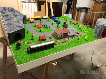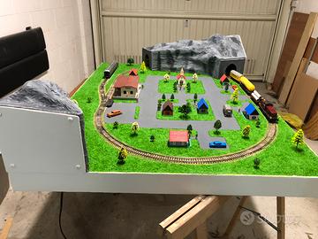 Vendo per nuovo progetto plastico ferroviario H0 in ordine e pulito, misura 130 x 100 comodo da trasportare in auto. Illuminazione delle casette e gallerie rimovibili per il trasporto.