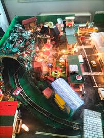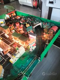 Il plastico è diviso in due semigusci da cm 106 x cm 60 x cm 26h Aperto invece misura 140 cm x 106 cm x 13 cm Telaio: Realizzato in multistrato di pioppo o betulla (10-12 mm) per coniugare leggerezza e rigidità torsionale. Meccanismo di chiusura: Le due metà sono unite sul lato lungo (140 cm) tramite cerniere a libro. Una volta chiuso (spessore 26 cm), le pareti esterne formano una valigetta autoportante. All'interno, lo spazio utile di 13 cm di altezza per lato permette di ospitare edifici, alberi e rilievi senza che si tocchino durante la chiusura. Materiali Ultra-leggeri: Per non appesantire la "valigia", i rilievi sono modellati come carta pesta. Gli edifici sono illuminati Il passaggio elettrico tra i due gusci avviene tramite passaggio cavi esterni al plastico e mascherati da panno verde Alimentazione DCC Si trasporta facilmente perché dotato di maniglie per evitare aperture accidentali. Ai piedi è munito di 4 rotelle per facile spostamento. Disponibile senza trenino elettrico. Impianto analogico che può essere digitalizzato volendo. Visibile a Cuneo. Consegno anche nel tragitto Alba Cuneo.