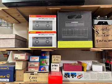 Vendita in blocco con locomotive, vagoni, casette, accessori e 2 trasformatori Hornby.