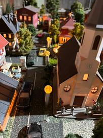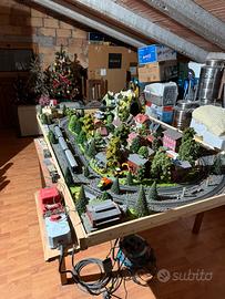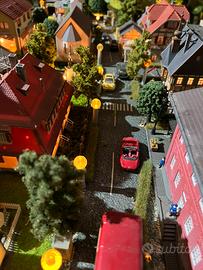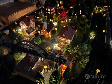 Stupendo plastico ferroviario illuminato costruito pezzo su pezzo .