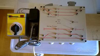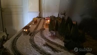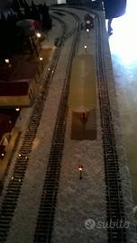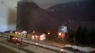 Composto da due moduli 2 x (2mx0,60) con sfondo che li divide. Il primo rappresenta una stazione di fantasia dell'Italia centrale con passaggio a livello fisso, scalo merci, stazione, pensilina, torre dell'acqua, deposito gasolio e posto di blocco. Il secondo modulo, nascosto dallo sfondo, è privo di paesaggio in quanto svolge la funzione di stazione nascosta che consente un realistico movimento di treni. L'impianto ha 8 scambi elettrici e 7 settori tutti comandati tramite quadro sinottico (in foto) comprensivo di trasformatore RR elettronico 4009 e 2 trasformatori ausiliari per le luci del plastico. Il materiale di armamento è Lima nickel silver. I treni nelle foto non sono compresi. Date le dimensioni non spedisco. Visionabile a Roma. Prezzo trattabile.