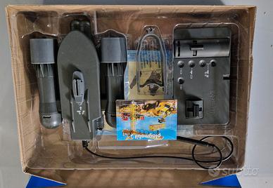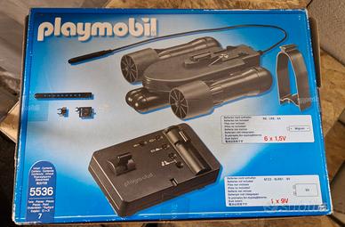 Motore radiocomandato subacqueo per il controllo remoto delle navi PLAYMOBIL (richiede 1 batteria da 9V e 6 batterie AA da 1,5 V). Il motore subacqueo ha una frequenza di 2,4 GHz. Quando la batteria del trasmettitore si sta esaurendo , il LED superiore sul trasmettitore si trasforma da verde a rosso.Quando la batteria del motore inizia ad esaurirsi, il LED sul trasmettitore (secondo dall'alto) passa dal verde al rosso. Quando diminuisce il contatto radio con il motore subacqueo al di sotto di una soglia critica, l'interruttore LED (terzo dall'alto) passa dal verde al rosso. Le imbarcazioni che possono essere aggiornate con il motore radiocomandato subacqueo hanno un simbolo sulla fusoliera.