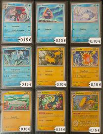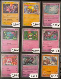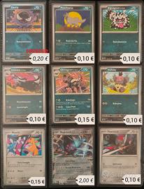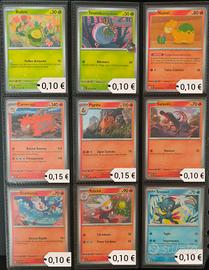 Non comprare ad 1 β¬. Vendo pacchetti di carte singole. Manco lista. Prezzi indicativi in base agli acquisti π. Lista: 001/217 β Oddish di Erika β 0,10 β¬ 002/217 β Gloom di Erika β 0,15 β¬ 004/217 β Bellsprout di Erika β 0,10 β¬ 008/217 β Chikorita β 0,10 β¬ 009/217 β Bayleef β 0,15 β¬ 011/217 β Wurmple β 0,10 β¬ 012/217 β Silcoon β 0,10 β¬ 013/217 β Beautifly β 0,15 β¬ 014/217 β Cascoon β 0,10 β¬ 016/217 β Budew β 0,10 β¬ 018/217 Tarountula del Team Rocket 0,10 β¬ 027/217 β Numel β 0,10 β¬ 028/217 β Camerupt β 0,15 β¬ 030/217 β Pignite β 0,15 β¬ 034/217 β Salandit β 0,10 β¬ 032/217 β Scorbunny β 0,10 β¬ 033/217 β Raboot β 0,10 β¬ 040/217 β Sneasel β 0,10 β¬ 045/217 β Weavile β 0,15 β¬ 046/217 β Snorunt β 0,10 β¬ 052/217 β Snom β 0,10 β¬ 054/217 β Glastrier β 0,15 β¬ 055/217 β Pikachu β 0,10 β¬ 056/217 β Raichu β 0,15 β¬ 059/217 β Tynamo β 0,10 β¬ 060/217 β Eelektrik β 0,15 β¬ 064/217 β Heliolisk β 0,15 β¬ 067/217 β Tapu Koko β 0,50 β¬ 069/217 - Tadbulb di Kissara - 0,10 β¬ 082/217 β Togekiss β 0,50 β¬ 085/217 β Misdreavus β 0,10 β¬ 087/217 β Ralts β 0,10 β¬ 091/217 β Banette β 0,15 β¬ 094/217 β Slurpuff β 0,15 β¬ 099/217 β Munkidori β 0,50 β¬ 102/217 β Hitmontop β 0,10 β¬ 103/217 β Meditite β 0,10 β¬ 104/217 β Medicham β 0,10 β¬ 108/217 β Groudon β 0,50 β¬ 112/217 β Riolu β 0,10 β¬ 117/217 β Carbink β 0,15 β¬ 118/217 β Rolycoly β 0,10 β¬ 119/217 β Carkol (ball) β 0,20 β¬ 120/217 β Coalossal β 0,50 β¬ 123/217 β Gastly β 0,10 β¬ 123/217 β Gastly (reverse) β 0,20 β¬ 128/217 β Poochyena β 0,10 β¬ 130/217 β Zigzagoon di Galar β 0,10 β¬ 131/217 β Linoone di Galar β 0,10 β¬ 132/217 β Obstagoon di Galar β 0,15 β¬ 138/217 β Vullaby β 0,10 β¬ 144/217 β Mawile β 0,15 β¬ 145/217 β Registeel ex β 2,00 β¬ 146/217 β Pawniard β 0,10 β¬