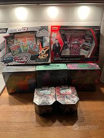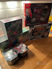 Materiale sealed: 1)ETB - Set Allenatore Fuoriclasse - Paradosso temporale - 60 euro 2)ETB - Set Allenatore Fuoriclasse - Evoluzioni a paldea - 80 euro 3)ETB - Set Allenatore Fuoriclasse - Segreto Fiabesco - 60 euro 4)TIN - Destino di Paldea - Charizard - 45 euro 5)TIN - Destino di Paldea - Solcoferreo - 30 euro 6)COLLEZIONE Mewtwo ex del Team Rocket - 25 euro 7)COLLEZIONE Victini - 25 euro Valuto scambio con lotti di carte pokemon in italiano in perfette condizioni