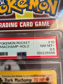 Pokemon Rocket Dark Machamp #10 con slab vintage PSA valutata 8.5 Lo slab presenta un segno nella parte superiore. Lingua inglese
