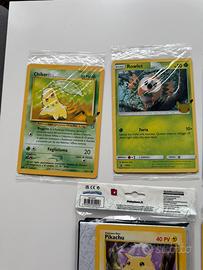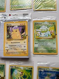 Pokemon set Gran Festa sealed JUMBO 25th Anniversario + album binder Pikachu ITA Lotto con il set delle 7 carte jumbo (carte giganti) promozionali del 25th Anniversario Pokemon. Il lotto comprende 7 le uscite mensili di pack di carte giganti promozionali, e l'album raccoglitore (formato jumbo) con all'interno compreso un Pikachu sempre formato gigante. Ogni pacchetto è SIGILLATO e perfettamente tenuto, sono tutti come nuovi. Anche l'album è sigillato e perfettamente conservato. Ogni pacchetto contiene 3 CARTE GIGANTI diverse, raffiguranti gli starters di ogni generazione Pokemon (dalla prima alla ottava). In totale la collezione conta 25 carte giganti diverse: 24 dai pacchetti + Pikachu dell'album. Lingua ITALIANA tutte. Le foto posso riscontrare dei bagliori in controluce che fanno sembrare il pack sciupato: ogni pack è invece in ottime condizioni e sigillato. All'occorrenza, non esitate a chiedermi altre foto. Prezzo riferito all'intero lotto, NON separabile.