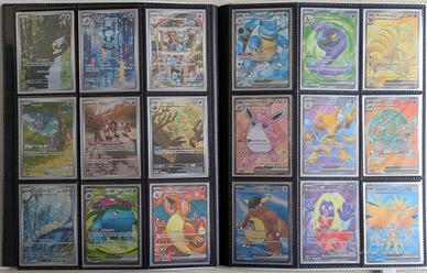 Vendo master set completo di 151 promo incluse. Lingua italiana e condizioni Near Mint. Le carte sono divise in due album di 151 (entrambi inclusi, usati ma in buone condizioni): - Nel primo album è contenuto il regular set quindi le carte dalla 1 alla 165. Tutte le comuni, reverse, holo, holo reverse e EX. (L'album non ha l'elastico per la chiusura) - Nel secondo album sono contenute promo, AR,SAR,FULL ART e GOLD (fuoriserie). Mancano le foto di alcune pagine del regular set a causa del limite di foto, ma le carte sono tutte. Le mando in chat se avete bisogno. Prendo in considerazione anche proposte per masterset senza promo. A disposizione per ulteriori foto e informazioni. Costo di spedizione elevato a causa del servizio di assicurazione del pacco, che verrà spedito tramite BRT