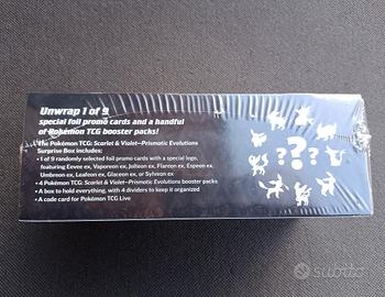 Pokémon Prismatic Evolution Surprise Box English Stellar Tera Ex Promo Foil Card Eevee Eevolutions Scarlet Violet Prodotto originale in lingua inglese! Sigillato con piccolo Difetto, vedere foto! Contiene - 4 Bustine Booster Packs di Prismatic Evolution - 1 su 9 possibile Carta Promo tra Eevee Ex , Vaporeon Ex , Jolteon Ex , Flareon Ex , Espeon Ex , Umbreon Ex , Leafeon Ex , Glaceon Ex , Sylveon Ex - Box per contenere il tutto , con 4 divisori Siamo un Negozio Professionale Imballato con protezioni! Disponibili anche altri Prodotti in vendita, dai un'occhiata!