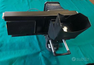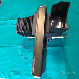 Polaroid MP4 Il kit include la testa, l'obiettivo Tominon f 105mm1:4.5 e il mirino reflex. fotocamera istantanea d'epoca, probabilmente una Polaroid Land Camera modello Automatic risalente agli anni '60. Queste fotocamere sono note per aver introdotto la fotografia istantanea nel 1947, soffietto estensibile e un corpo macchina robusto.