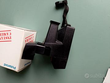 Polaroid Spirit 600 CL vintage in buone condizioni estetiche, completa di scatola originale con scritte Polaroid e timbro INSTANT CAMERA. Corpo nero con caratteristica fascia arcobaleno, doppio obiettivo e flash integrato. Ideale per collezionisti o per chi vuole provare la fotografia istantanea retrò.