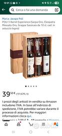Vendo scatola in legno contenente nr 3 bottiglie da 100 ml di grappa poli; una sarpa oro, una Cleopatra e una sassicaia