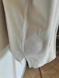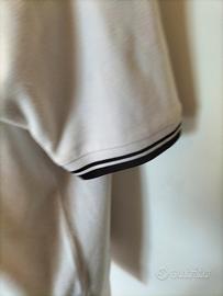 Colore bianco,riporti in blu nelle maniche e nel colletto, spacchetti laterali.