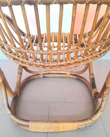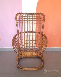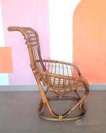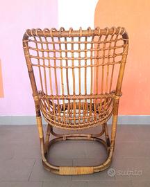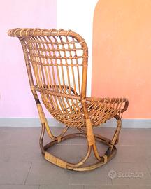 Questa particolare seduta unisce linee naturali e intrecci artigianali in malacca e giunco, piena espressione del design organico tipico degli anni '60.