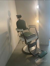 Poltrona da barbiere anni 50 completamente originale con pelle verde inglese, porta rotolo nell’’appoggiatesta, pelle anche nell’appoggia piedi. La base circolare la rendono elegante ed adatta a qualsiasi contesto abitativo o di attività.