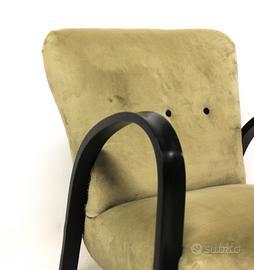 Particolare poltrona Dèco con struttura in noce italiana laccata nera. Nuova imbottitura e rivestimento con velluto verde/tortora e piping in velluto nero. Provenienza: Italia Epoca: 1930 Dimensioni: L70 x P75 x H78 x Hseduta35 cm