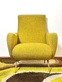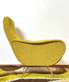 Poltrona "LADY" Anni 50 Design attribuito a MARCO ZANUSO capolavoro del made in Italy, Lady è stata premiata con la Medaglia d’Oro alla IX Triennale di Milano del 1951. La Poltrona è di manifattura Italiana ,completamente restaurata con rivestimento e interni nuovi,tessuto in cotone di colore Light Yellow,inconfondibile style della scocca del Designer Marco ZANUSO ,piedi in Ottone con forma a cono,tipico Design degli anni 50. CONDIZIONI PERFETTE Misure Altezza cm 90/Larghezza cm 67/Profondità cm 90/Altezza seduta cm 40/ Seduta cm 50 X cm 50