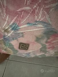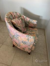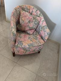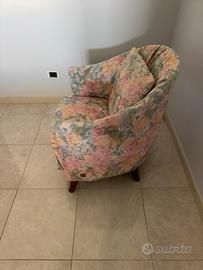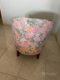Poltrona vintage con design floreale e una forma avvolgente a "pozzetto" (o cabriolet), tipica dell'arredamento degli anni '50, '60 o '70. Rivestimento in tessuto sfoderabile con motivi floreali multicolore su base chiara. Struttura in legno e piedini a vista, con cuscino coordinato visibile nell'immagine. Larghezza 65 cm, altezza 84 cm. (Gianni)
