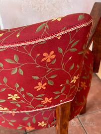 Leleu. E' stata di recente rifoderata, presenta un tessuto bordeaux con motivi floreali dorati, rossi e verdi. Questa bellissima stoffa fa sì che la poltroncina possa essere inserita sia in arredi classici ma anche in spazi contemporanei ed eleganti. La struttura è in buono stato presenti leggeri segni del tempo.