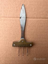L'oggetto mostrato nell'immagine è un punzone da maglieria (chiamato anche punzone a crune o transfer tool), un accessorio utilizzato con le macchine da maglieria manuali. Questo strumento specifico ha tre punte metalliche dotate di una cruna (un piccolo occhiello) all'estremità.