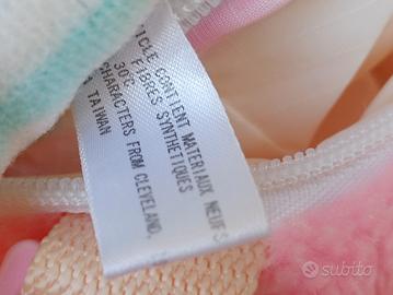 Popple rosa , col pancino di colore blu , " cuffia " e bavaglino a righe bianche e acquamarina , un orecchio verde e l'altro bianco , qualche ricciolo di capelli gialli spunta dalla cuffietta , pon pon coda dalle tonalità rosa / rosa fucsia , una guancia rosa l'altra lilla , tiene in mano il suo biberon giallo e verde , babbucce color acquamarina la suola riprende la fantasia a righe della bavaglia e cuffia ...naso rosa e occhi sono in plastica , interno e zip di colore bianco