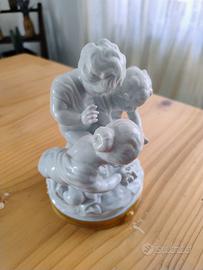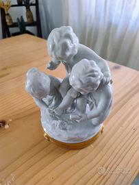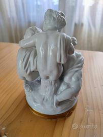 Stupendo gruppo scultoreo composto da tre cherubini, in finissima porcellana bianca Capodimonte e dettaglio in oro zecchino sul basamento. Rappresentante 3 putti, amorini, angeli nell'atto di accendere un piccolo fuoco. Il marchio d'attribuzione si trova sotto alla base: la N coronata in blu di Capodimonte. Opera numerata: "8836" "23"