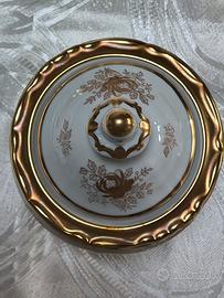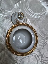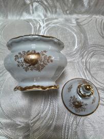 STUPENDA ZUCCHERIERA. ANNI 40 ,DEL SECOLO SCORSO, IN PORCELLANA BIANCA CON DECORAZIONI DI ROSE. IN ORO E BORDI RICCAMENTE DORATI , MARCATA WEIMAR MODELLO KATHARINA MADE IN ( G D R , ) . (. GERMANIA. DEMOCRATICA REPUBBLICA) MISURA 10,5 CM DIAMETRO ALTEZZA 14,CM. COL COPERCHIO, CONDIZIONI PERFETTE PARI AL NUOVO, VENDO EURO 44. EVENTUALE SPEDIZIONE +10 EURO, FORMULA VISTO E PIACIUTO NO RESI SI ACCETTA SOLO PAGAMENTO IN CONTRASSEGNO E SOLO FRA INTERESSATI. ASTENERSI PERDITEMPO GRAZIE